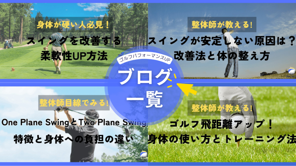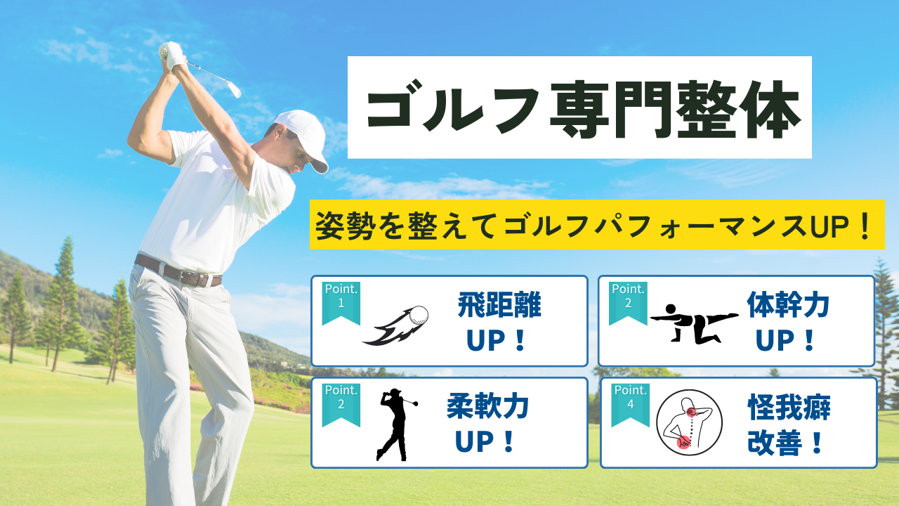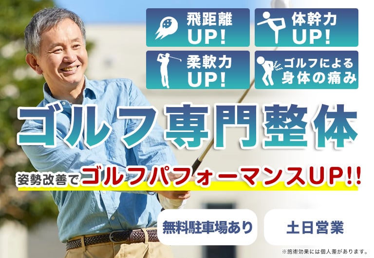 骨盤・背骨は体の根本となる土台になる場所です。この土台が不安定で歪みがあることで、思うように体が使えずゴルフでの怪我のリスクやパフォーマンスが低下してしまいます。骨盤、背骨を矯正しスイングの安定性、慢性腰痛などの改善につながります。