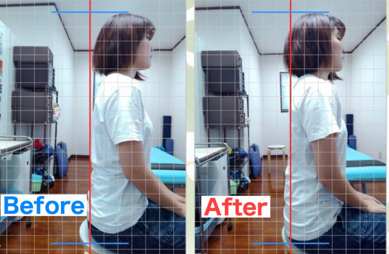 施術前は良い姿勢を保とうと頑張っても写真のように赤い線から後頭部が離れてしまいます。施術後は背骨、骨盤を整えたことで頭の位置が正されて後頭部が赤い線に近づきました。