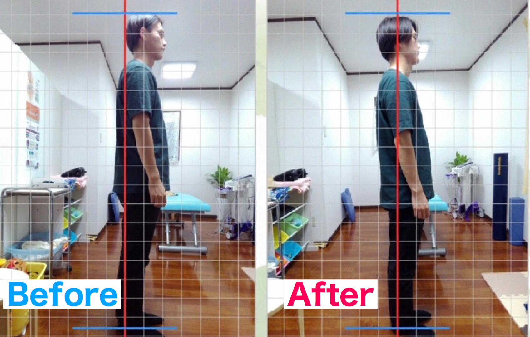 施術前は良い姿勢を保とうと頑張っても写真のように赤い線から後頭部が離れてしまいます。施術後は背骨、骨盤を整えたことで頭の位置が正されて後頭部が赤い線に近づきました。