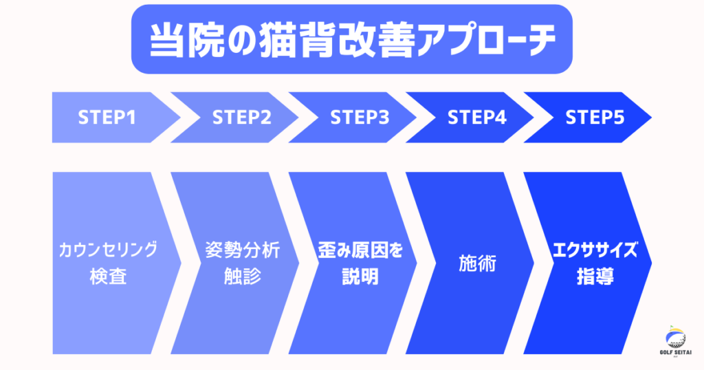 当院では、姿勢分析をもとに原因を特定し以下のステップで改善を進めていきます。