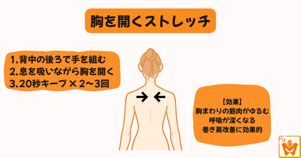 胸が開くだけで、肩の位置が後ろに戻り猫背が自然と改善しやすくなります。