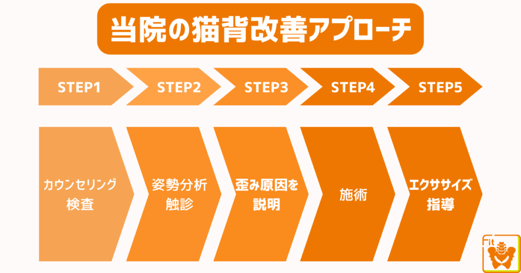 当院では、姿勢分析をもとに原因を特定し以下のステップで改善を進めていきます。